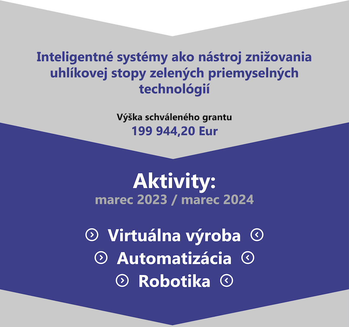 Projekt „Inteligentné systémy ako nástroj znižovania uhlíkovej stopy zelených priemyselných technológií “ získal grant z Islandu, Lichtenštajnska a Nórska v sume 169 524,17 € prostredníctvom Grantov EHP. Projekt bol spolufinancovaný v sume 29 916,03 € z prostriedkov štátneho rozpočtu Slovenskej republiky. Cieľom projektu je pomocou prezenčných a mobilitných aktivít zvýšiť vedomosti o aplikácii inteligentných systémov s využitím automatizácie, virtualizácie a optimalizačných procesov s cieľom znížiť uhlíkovú stopu priemyselných technológií a tým zlepšiť ich vplyv na životné prostredie.